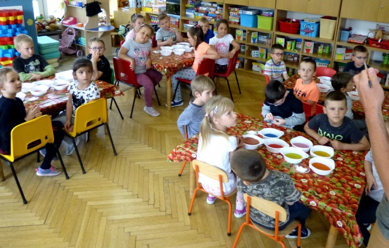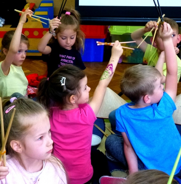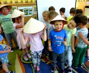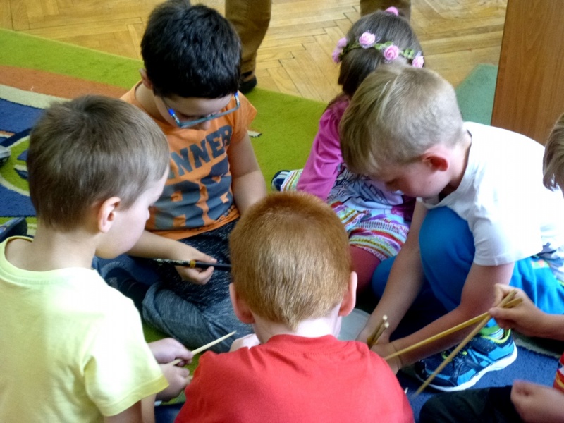 W kwietniu odwiedził nas pan Piotr Mojżyszek z firmy „Opowiadamy o świcie” i przeprowadził warsztaty etnograficzne zatytułowane „Dzieci świata – Azja”. W pierwszej części warsztatów każda grupa obejrzała prezentację na temat kultury i życia na dalekim wschodzie z komentarzem prowadzącego. Dzieci dowiedziały się o różnorodnych budowlach, zwyczajach, jedzeniu i zabawach dzieci Azji. W części drugiej dzieci wykonały pracę plastyczną z kolorowego piasku oraz próbowały swoich sił w posługiwaniu się pałeczkami, którymi na co dzień mieszkańcy Azji zjadają posiłki. Dzieci przymierzały charakterystyczne stroje oraz czapki ze słomy. Warsztaty były bardzo ciekawe i wzbudziły duże zainteresowanie dzieci.